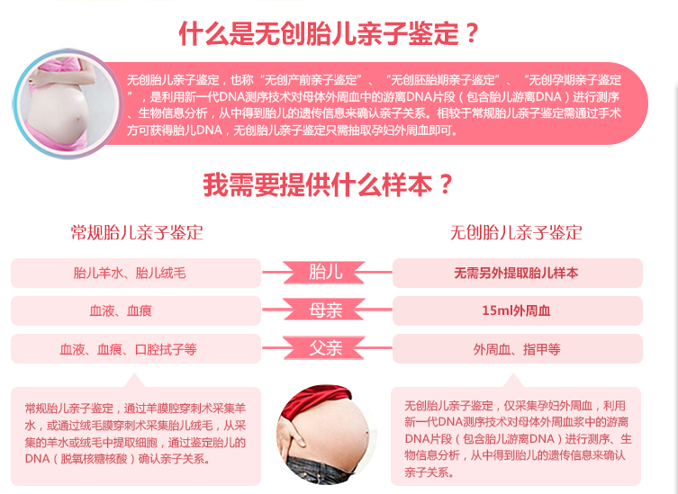 无创胎儿亲子鉴定,也称“无创产前亲子鉴定”、“无创孕期亲子鉴定”、“静脉血亲子鉴定”,是利用新一代DNA测序技术对母体外周血中的游离DNA片段(包含胎儿游离DNA)进行测序、DNA信息分析,从中得到胎儿的遗传信息来确认亲子关系。相较于常规胎儿亲子鉴定需通过羊水,绒毛穿刺手术采集胎儿DNA,无创胎儿亲子鉴定只需抽取孕妇10ml外周血(静脉血)即可,无创、安全、准确。