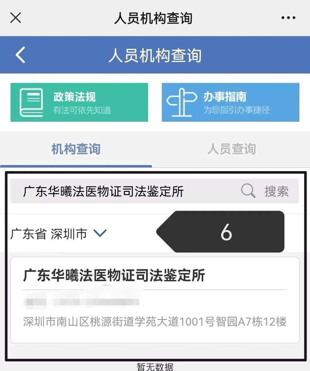 通过微信小程序搜索进入“粤省事”小程序,在“粤省事”小程序首页选择“部门专区”——“法律服务专区”——“法律服务专区首页——便捷办事--法律服务机构查询--司法鉴定机构”,在“业务范围描述”选择为“法医物证司法鉴定”,在“所属区域”选择“深圳市”。