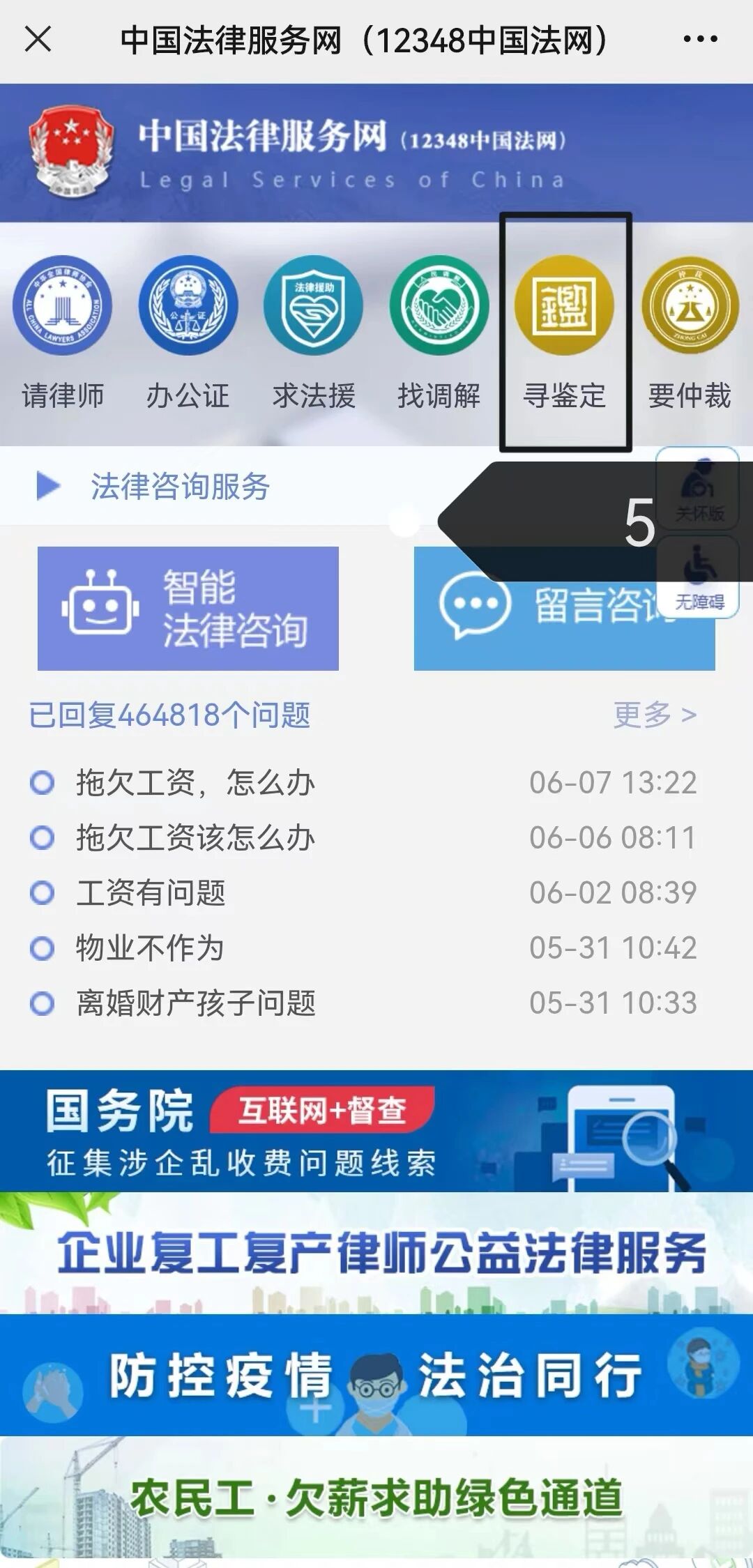 在【法律服务办事指南】页面点击【司法鉴定】选项,选择【寻鉴定】